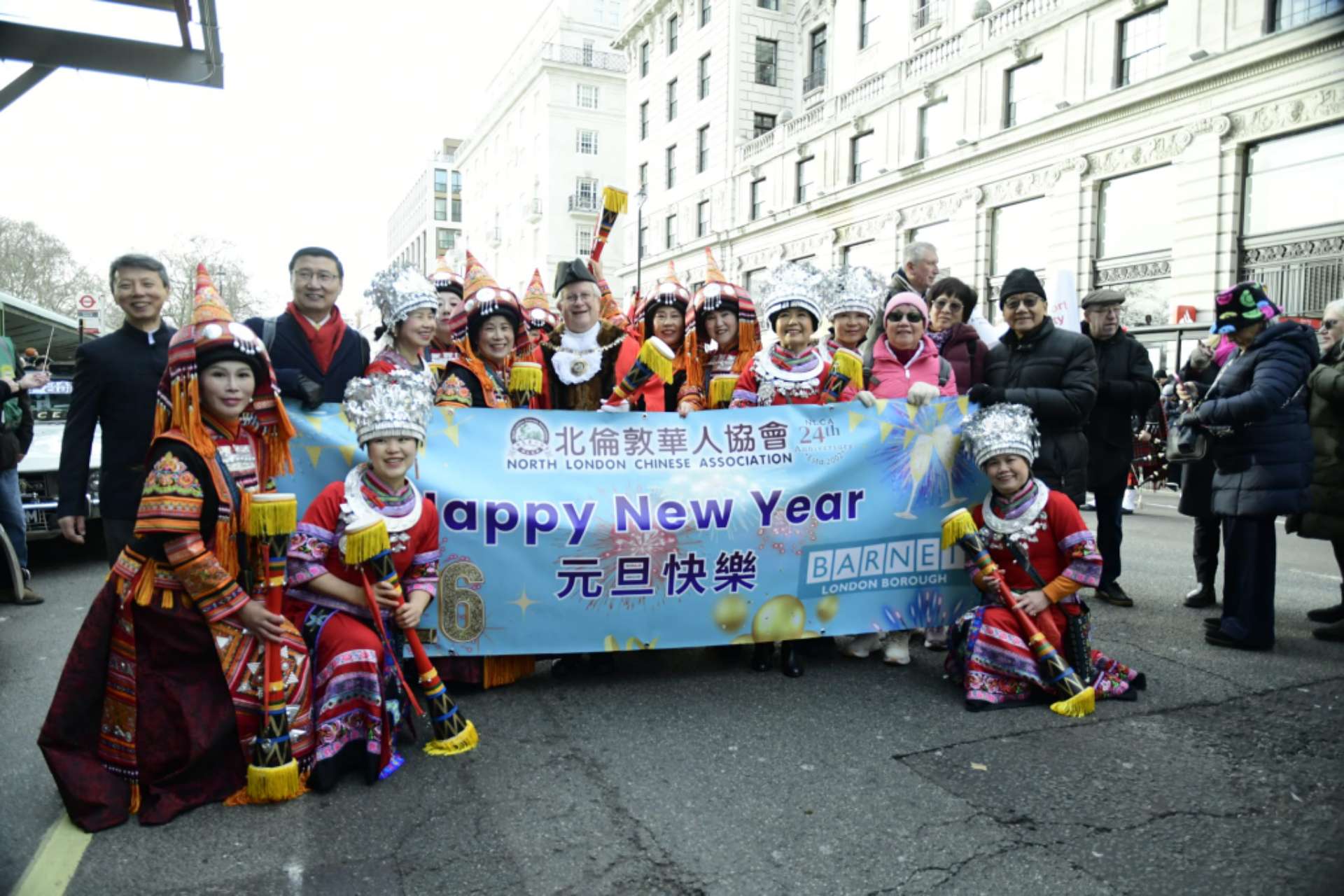 2026年元旦当天,天气晴朗,阳光明媚,北伦敦华人协会(NLCA)参加巡游活动的人员早早来到组织者指定安排的集结地点报到和准备,并与其他巡游队伍和观众交流互动,合影拍照。长鼓舞队特有的中国瑶族民族服装和长鼓,立刻吸引了很多其他巡游团队和现场观众,都过来与长鼓舞队的成员拍照,甚至还有的英国本地人在长鼓舞队成员的帮助下,穿上瑶族民族服装来拍照留念。伦敦巴尼特市(Barnet London Borough)丹尼.里奇(Cllr. Danny Rich)市长到达后,分别与所有代表巴尼特市(Barnet London Borough)参加巡游的团队合影,并与现场的观众热烈交谈,气氛十分融洽。